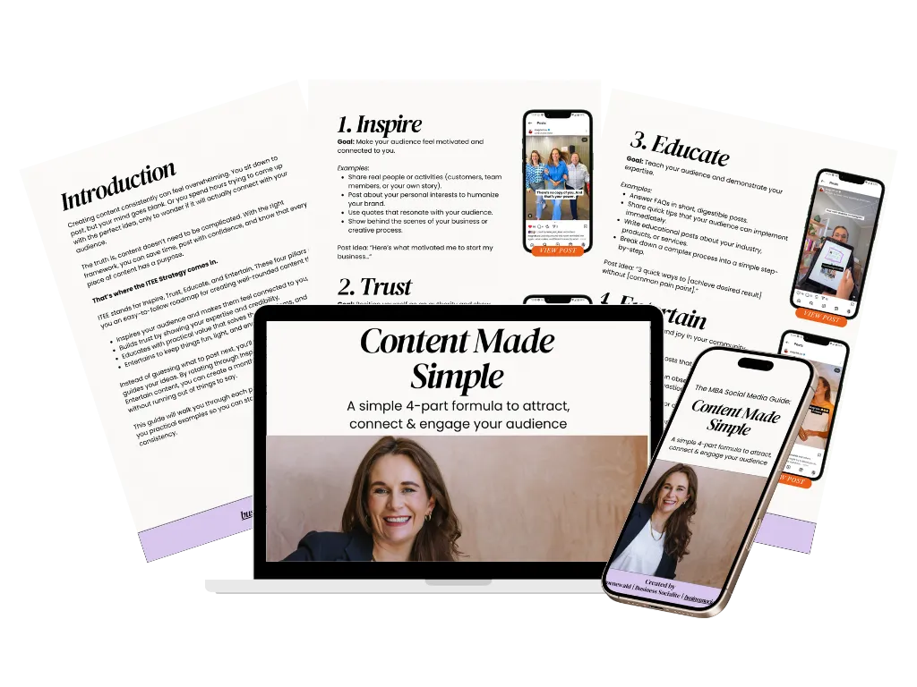 In this free guide, you’ll discover the ITEE Strategy, a step-by-step framework small businesses are using to create social media content that inspires, builds trust, educates, and entertains—without feeling overwhelmed or stuck.