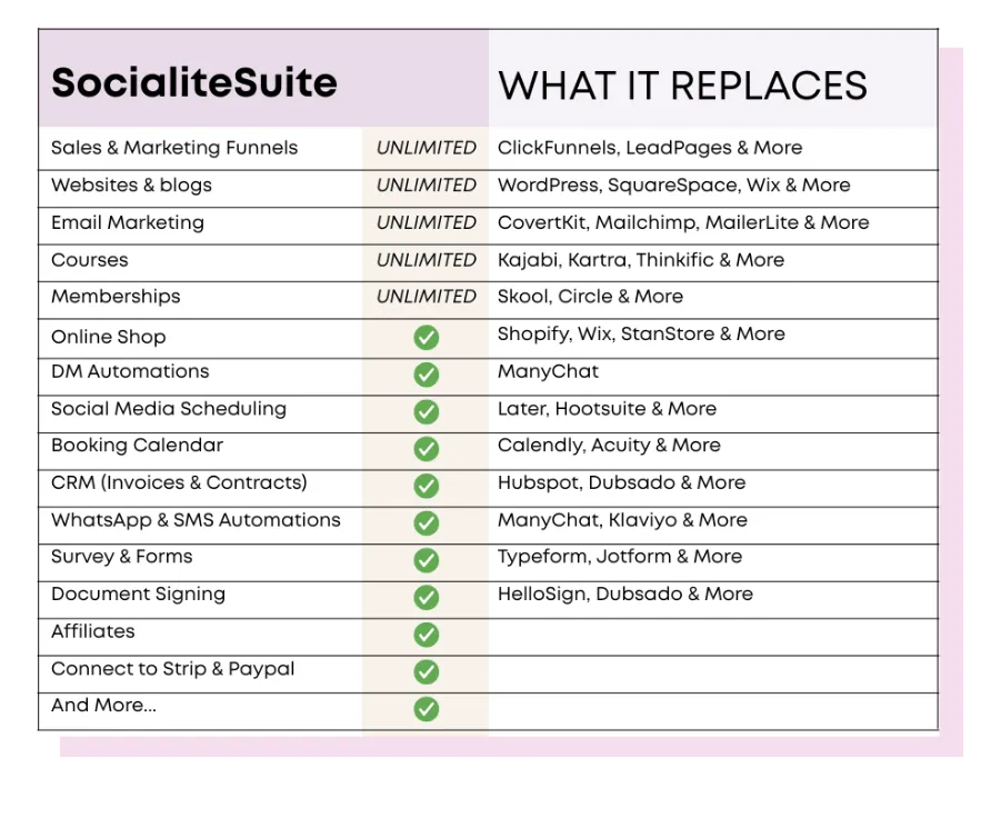SocialiteSuite won't write your sales copy while you sleep. It won't film your course videos. And it definitely won't knock on doors hunting for clients (though that would be cool, right?).